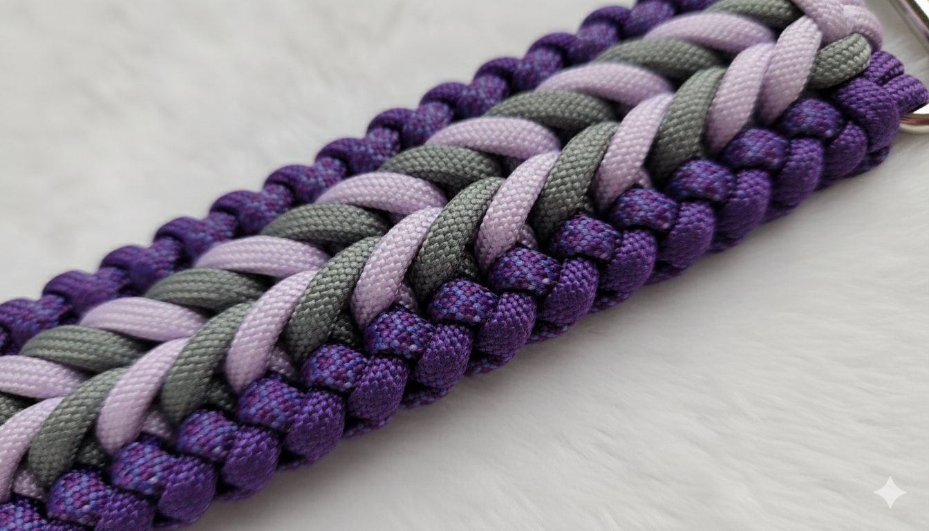 Close-up of a woven keychain made of purple, gray, and black paracord.